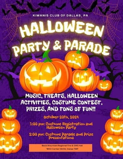 Hosted by the Kiwanis Club of Dallas, the annual Halloween Parade and Party for children - day care through middle school - will be held on Sunday, October 20, 2024, from 1 P. M. to 3 P. M., inside Back Mountain Regional Fire Station 121, located at 184 East Center Hill Road, Dallas, PA 18612 (across from the Little League Field at the intersection of East Center Hill Road and Church Street, Dallas). This is a rain or shine event.