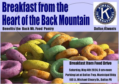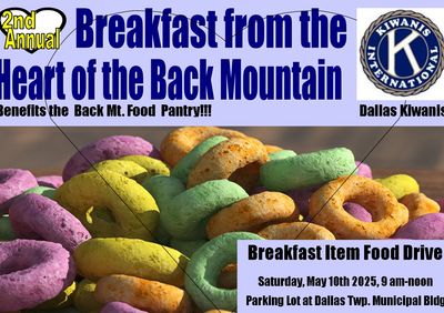 The Kiwanis Club of Dallas PA will host the club's 2nd Annual “Breakfast from the Heart of the Back Mountain”, a food collection drive to benefit the Back Mt. Food Pantry, on Saturday, May 10th, 2025, 9 a.m.-noon, in the Dallas Township Municipal Building parking lot located at 105 Lt. Michael Cleary Drive, in Dallas.