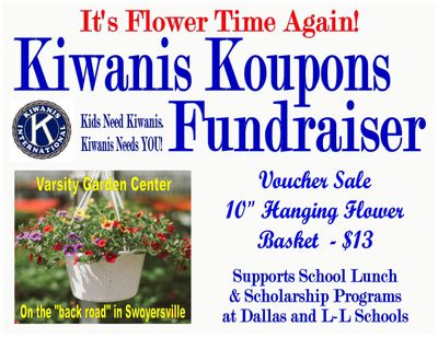 The Kiwanis Club of Dallas PA is pleased to announce the return of its annual Kiwanis Koupons Voucher Sale, and just in time for Mother’s Day! The purchase of vouchers entitles holders to any of the vast array of 10” hanging flower baskets that will be on display at Varsity Garden Center, located at 1204 Main St., Swoyersville from May 1 through June 30, 2023.